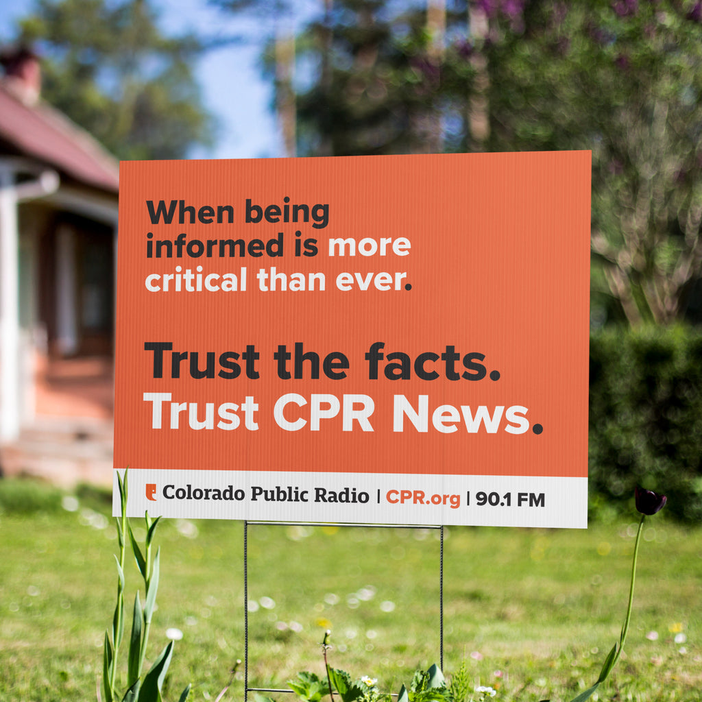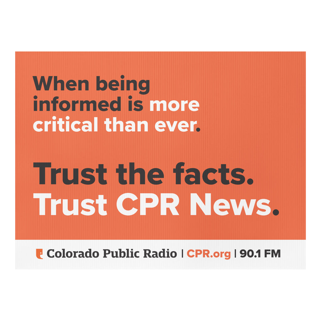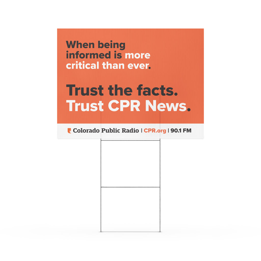Let your neighborhood know where you stand. This CPR News yard sign makes a clear, powerful statement: Trust the facts. Trust CPR News. With a sturdy aluminum h-stake stand and matte finish, it’s weather-ready, fully recyclable, and easy to set up. Perfect for showing your support for fact-based, independent journalism, right from your front lawn.