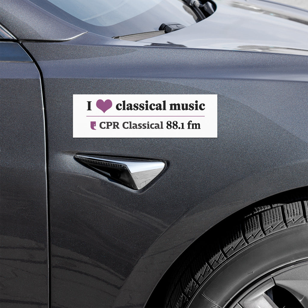 Take your love of classical music on the road! This 'I ❤️ Classical Music' magnet, complete with the CPR Classical logo and frequency, is the perfect way to show off your good taste to fellow drivers. Weather-resistant with a strong magnetic backing, it sticks with you - rain or shine - and can be easily moved or swapped. A subtle nod to symphonies, sonatas, and your favorite station, wherever the road takes you.